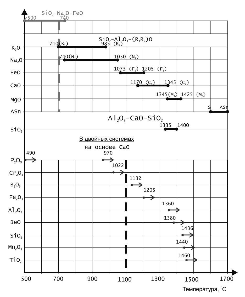 Очевидно, что понизить температуру образования легкоплавкого расплава можно только корректировкой состава и не одним компонентом, а комплексной добавкой, содержащей все перечисленные оксиды в нужном соотношении как в самой легкоплавкой эвтектике в системе FeO – Na2О – SiO2,