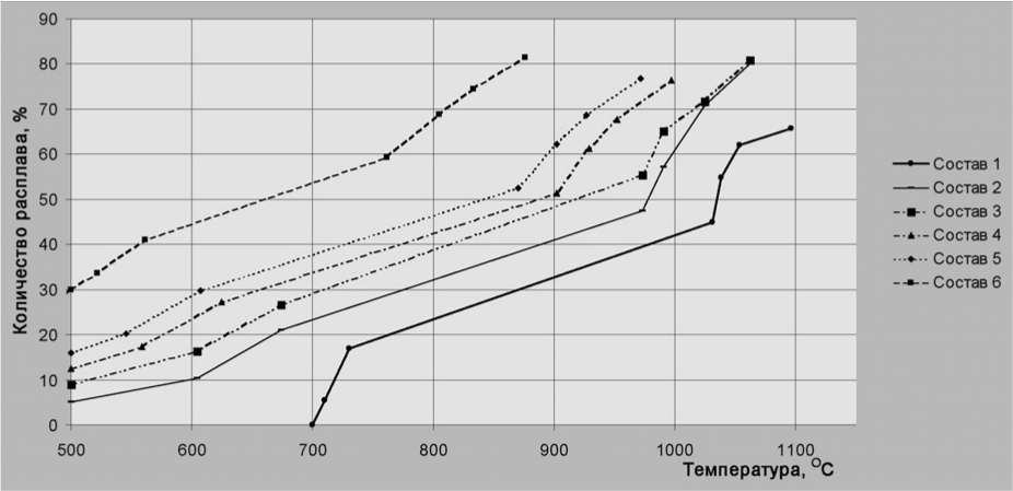 Fig. 2. Dynamics of melt formation in compositions based on Lokosovsky loam