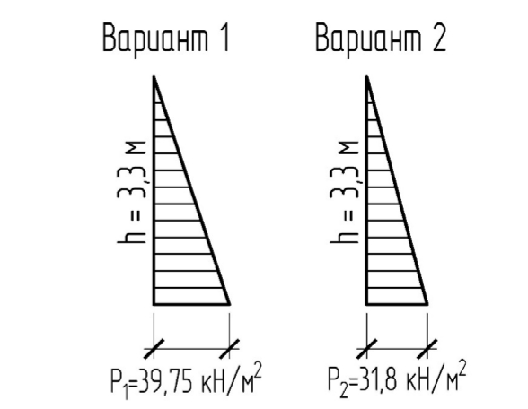 - Рассмотрим варианты бокового давления при изменении объемного веса бетонной смеси при p1 = 25,0 кН/м3 и p2 = 23,0 кН/м3.