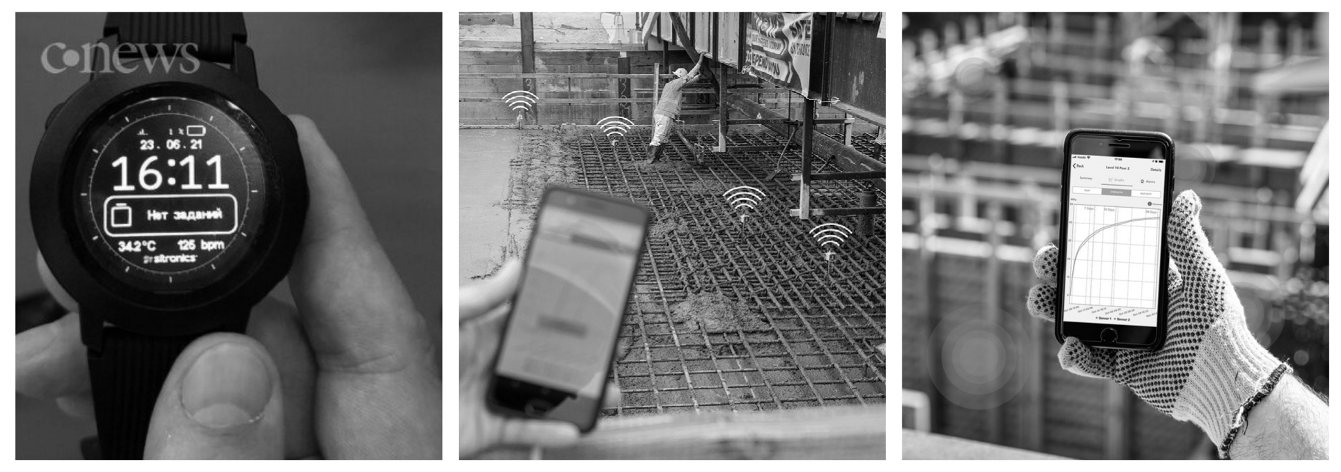 In the summer of 2021, the Russian company Sitronics introduced the Sitronics Smart Watch, which is designed specifically for construction teams. Among other things, the watch measures the pulse and body temperature and, in the event of critical deviations, transmits an alarm. The foreman can assign tasks to the brigadier through the web interface, and he can send back the status of completion. The foreman and brigadier can see in real time where the workers are.