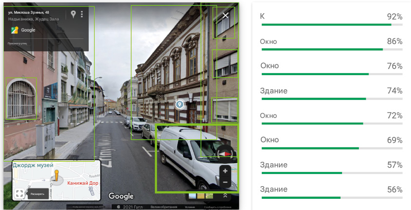 Демонстрация особенностей, обнаруженных с помощью API Google Cloud Vision на изображении уличного вида [17]