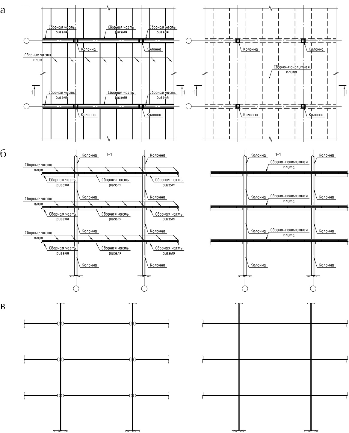 Рис. 1. Конструктивное решение поэтапно возводимого сборно-монолитного каркаса (план, разрез, расчётная схема, слева – 1-й этап, справа – 2-й этап): a – план; б – разрез; в – расчётная схема
