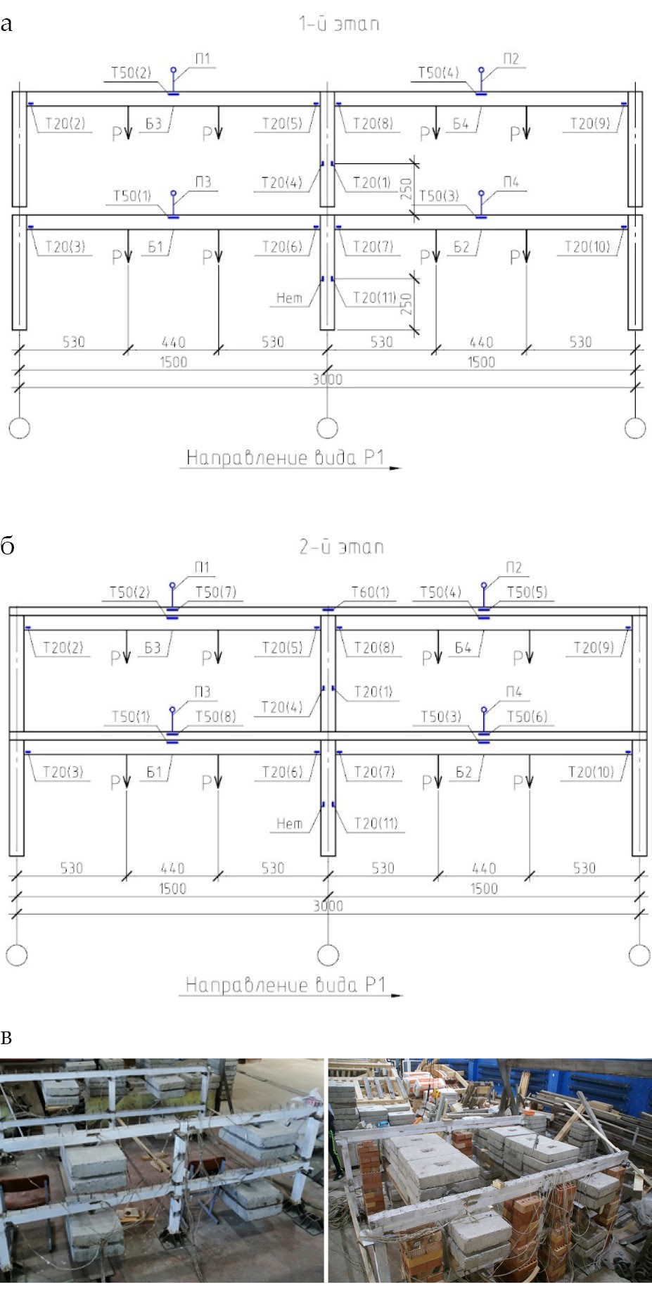 Проведены экспериментальные исследования плоских двухпролётных и двухэтажных рам Р1 и Р2, изготавливаемых и загружаемых в два этапа (рис. 2). Цель – изучение особенностей формирования напряженно-деформированного состояния в процессе монтажа и загружения сборно-монолитного каркаса. Сборные элементы выполнены из тяжёлого бетона кл. В25, а применяемый монолитный бетон – керамзитобетон кл. В15,5. На 1-м этапе происходило устройство сборной части рам – сборные колонны (70×70×1200 мм) и сборные части ригелей (70×70 х 1410 мм, в нижней зоне 3Ø3В500). На 2-м этапе, без снятия нагрузки 1-го этапа, устанавливалась верхняя продольная арматура в опорной зоне ригелей с укладкой монолитного бетона на высоту 40 мм.