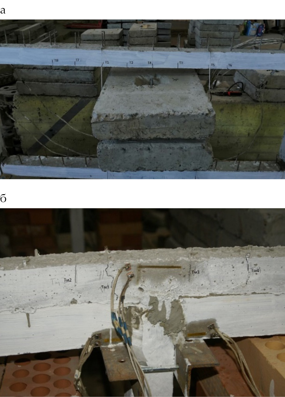 - образование первых трещин в ригелях рам происходило в рамках 1-го этапа загружения. На 1-м этапе с шагом 70‒100 мм образовывались волосяные трещины в середине пролёта сборных частей балок (рис. 3, a). Они распространялись на высоту 20‒30 мм при ширине раскрытия не более 0,05 мм;