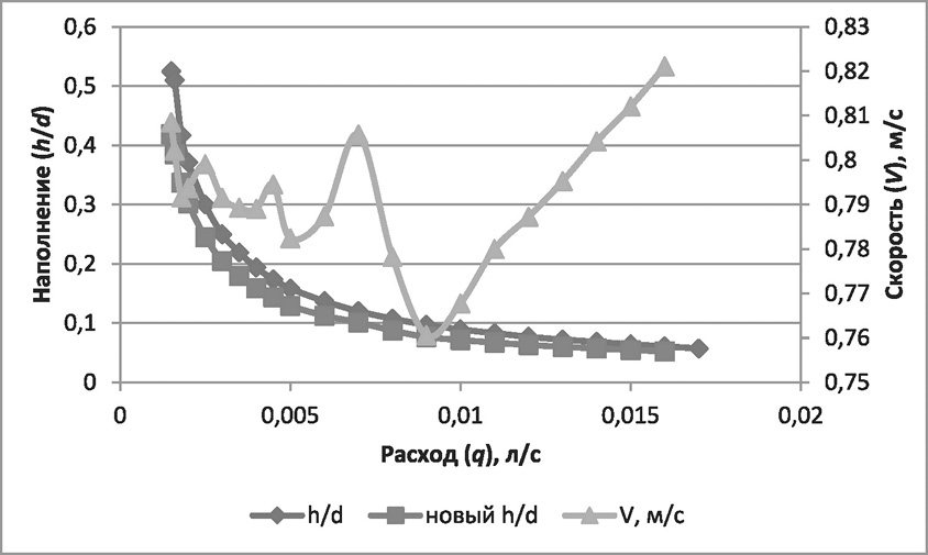 Табл. 3 и рис. 3 показывают, что действительно, скачкообразное изменение скорости обусловлено неточностью при определении значений по таблицам линейной интерполяцией. Отличие скоростей движения воды по самотечным трубам, при снижении расчетного расхода на треть по отношению к расходу, при котором скорость была минимальная (самопромывающая), полученных по расчетным зависимостям, по сравнению с полученными по таблицам Рекомендаций интерполированием, составило от минус 3,48 до плюс 4,18 %. Аналогичное отличие наполнения трубы составило от минус 6,69 до плюс 2,86 %.