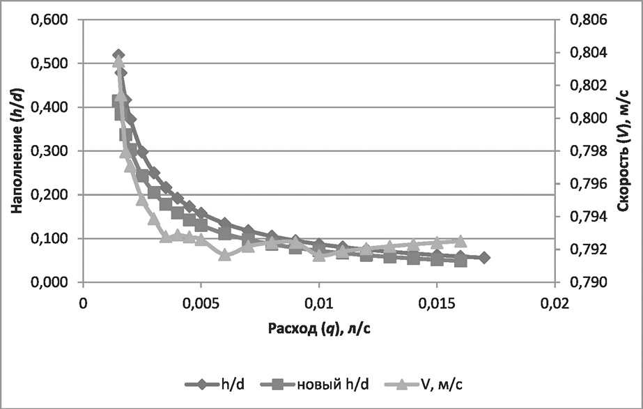 Рис. 3. Наполнение при минимальной скорости, наполнение и скорость при снижении расхода трубы DN = 500 мм (определены по расчетным зависимостям)