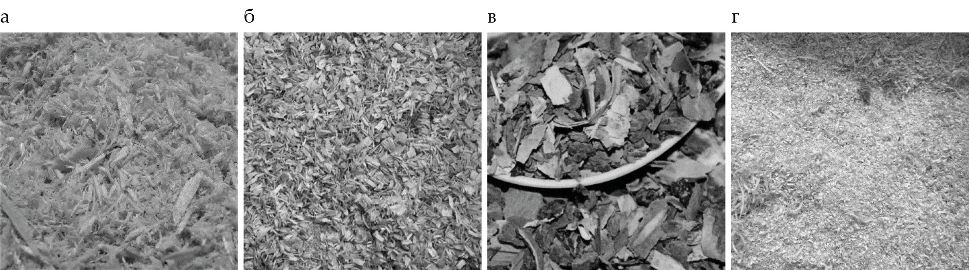 Образцы исследуемых растительных отходов: а – сосновые опилки; б – измельченные ветки тополя; в – измельченные ветки березы; г – измельченные ветки клена