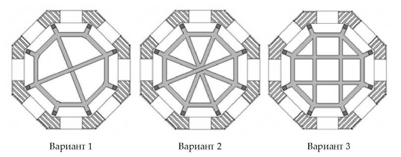 Как показывает практика, наиболее часто применяются три варианта этих конструкций, предполагающие радиальную или параллельную установку балок (рис. 2).