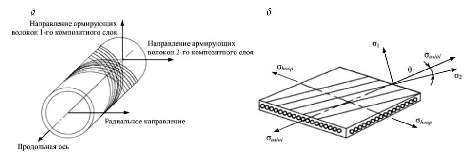 При работе композиционных материалов нагрузки в основном воспринимаются армирующими волокнами, так как трубы представляют собой определенную конструкцию для восприятия нагрузок от внутреннего давления, осевого растяжения, изгиба и т. п. [8, 9].