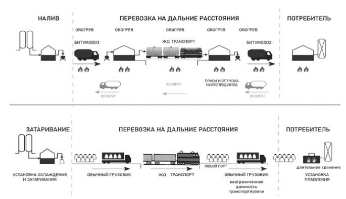 Рис. 1. Принципиальные схемы транспортировки жидких и фасованных битумных вяжущих