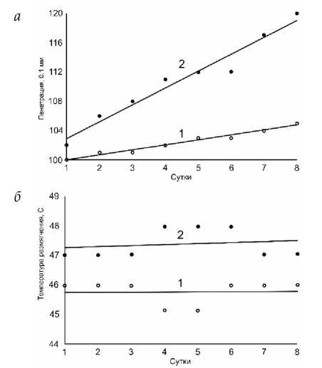 Рис. 2. Динамика изменения глубины проникания иглы при 25 °C (а) и температуры размягчения (б) для БНД 100/130 2022 (1) и 2023 (2) годах производства