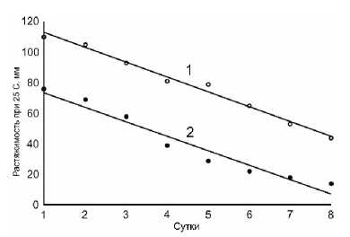 Для двух серий испытаний битумов наблюдается увеличение глубины проникания иглы при 25 °C в течение первых 8 сут (рис. 2). При этом значения температуры размягчения битумов сохраняются стабильными. Помимо пенетрации, за наблюдаемые 8 сут происходит существенное изменение растяжимости вяжущих при 25 °C (рис. 3).