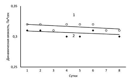 Рис. 4. Динамика изменения динамической вязкости для образцов БНД 100/130, произведенных и расфасованных в 2022 (1) и 2023 (2) годах