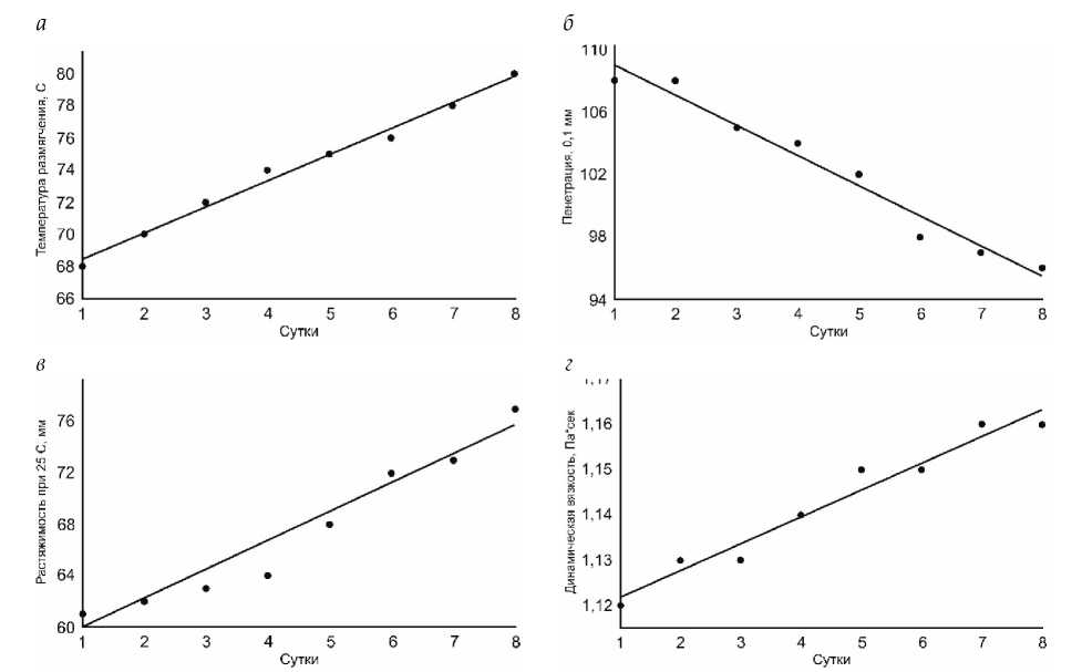 Рис. 5. Динамика изменения физико-механических характеристик ПБВ 90: а – температура размягчения; б – пенетрация при 25 °C; в – растяжимость при 25 °C; г– динамическая вязкость