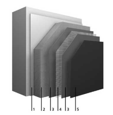 Рис. 2. Последовательность слоев по технологии «мокрый фасад»: 1 ‒ клеевой слой; 2 ‒ минеральный утеплитель; 3 ‒ базовый клеевой слой; 4 ‒ армирующая сетка; 3 ‒ финишный клеевой слой; 5 ‒ декоративная штукатурка