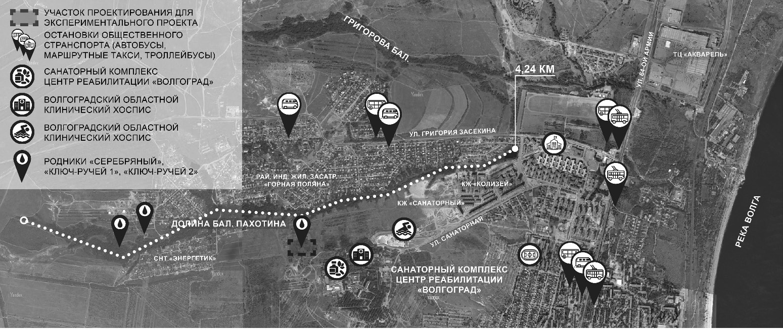 Балка Пахотина, участок для которой был выбран в качестве территории для экспериментального проектирования, простирается в длину около 4 км, территориально находится вблизи с оздоровительным санаторным комплексом Центр реабилитации «Волгоград», аквапарком «Акватория», а также жилыми комплексами «Колизей» и «Санаторный» (рис. 2, 3). В других частях долины по бокам располагается частная индивидуальная застройка посёлка «Горная поляна» и садоводческого некоммерческого товарищества «Энергетик». На территории долины ещё сохранилась значительная часть речки и мелких озёр. Помимо этих акваторий на территории долины располагается три родника – родник «Серебряный» и два других, не имеющих названия, посетители называют их «Ключ-ручей». С градостроительной точки зрения при организации санаторно-рекреационного комплекса на территории близ Центра реабилитации «Волгоград» и аквапарка «Акватория» не должно возникнуть проблем с организацией инженерных сетей, так как вокруг уже есть сеть развитой инженерной городской инфраструктуры, которую можно продлить и развить со стороны жилых комплексов Санаторный и Колизей. Транспортная инфраструктура не выполнена, но имеется большой потенциал в её формировании за счёт существующих подъездов к объектам и наличия ряда грунтовых дорог. С точки зрения землепользования данная территория не относится к зонам особоохраняемых природных территорий, а по правилам землепользования и застройки этот участок относится к зоне «рекреационного назначения ‒ санаторно-курортного лечения, отдыха и туризма». Поэтому именно эта территория была выбрана в качестве иллюстрации к формированию санаторно-рекреационной инфраструктуры в долинах малых рек Волгограда. Экспериментальный проект санаторно-рекреационного центра на этой территории представлен в последней части статьи.
