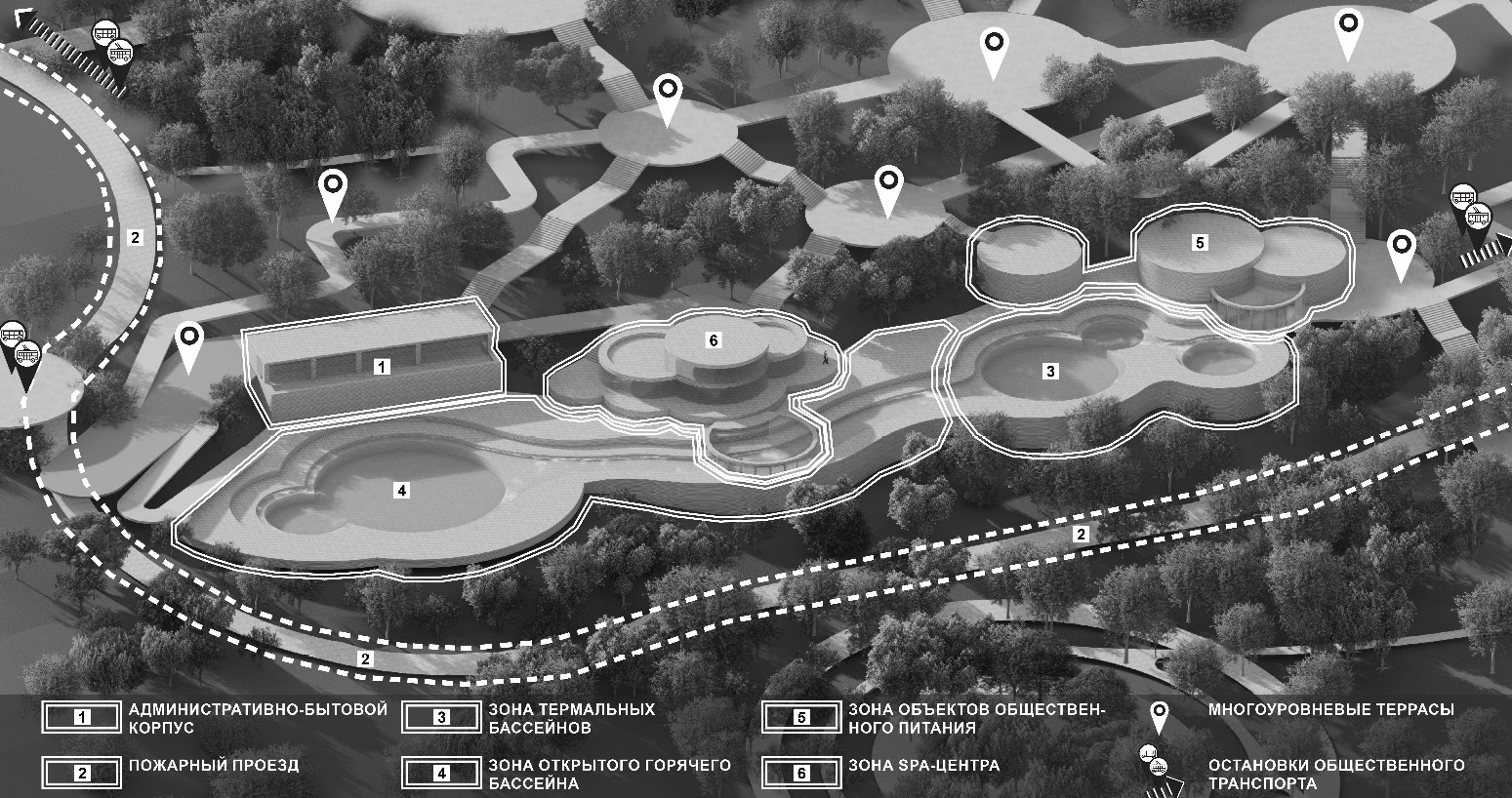 - Зона термальных бассейнов. Открытые и закрытые бассейны с водой различной температуры и минерального состава, обеспечивающие возможность проведения бальнеологических процедур в любое время года. Расположение бассейнов на разных уровнях позволяет создать визуально интересное и разнообразное пространство.