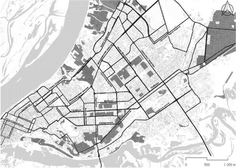 Еще одна особенность Самары – это наличие в структуре города значительного количества малоэтажной хаотичной застройки, которая существует и по сей день (рис. 3). Частный сектор, состоящий преимущественно из одно- и двухэтажных домов, занимает большие площади и представляет собой своеобразный территориальный резерв. Исторически такие районы возникли еще в дореволюционный период, когда город активно развивался и расширялся за счет пригородных территорий. В советский период строительство многоквартирных домов шло параллельно с сохранением частных владений. Сегодня такой подход утратил актуальность. Со временем промышленные предприятия стали перемещаться за пределы города, освобождая пространство, пригодное для других видов использования и новых строительных проектов. В последние десятилетия наблюдается активное освоение данных территориальных резервов, а также участков, освобождающихся от ветхого и аварийного жилого фонда [5].