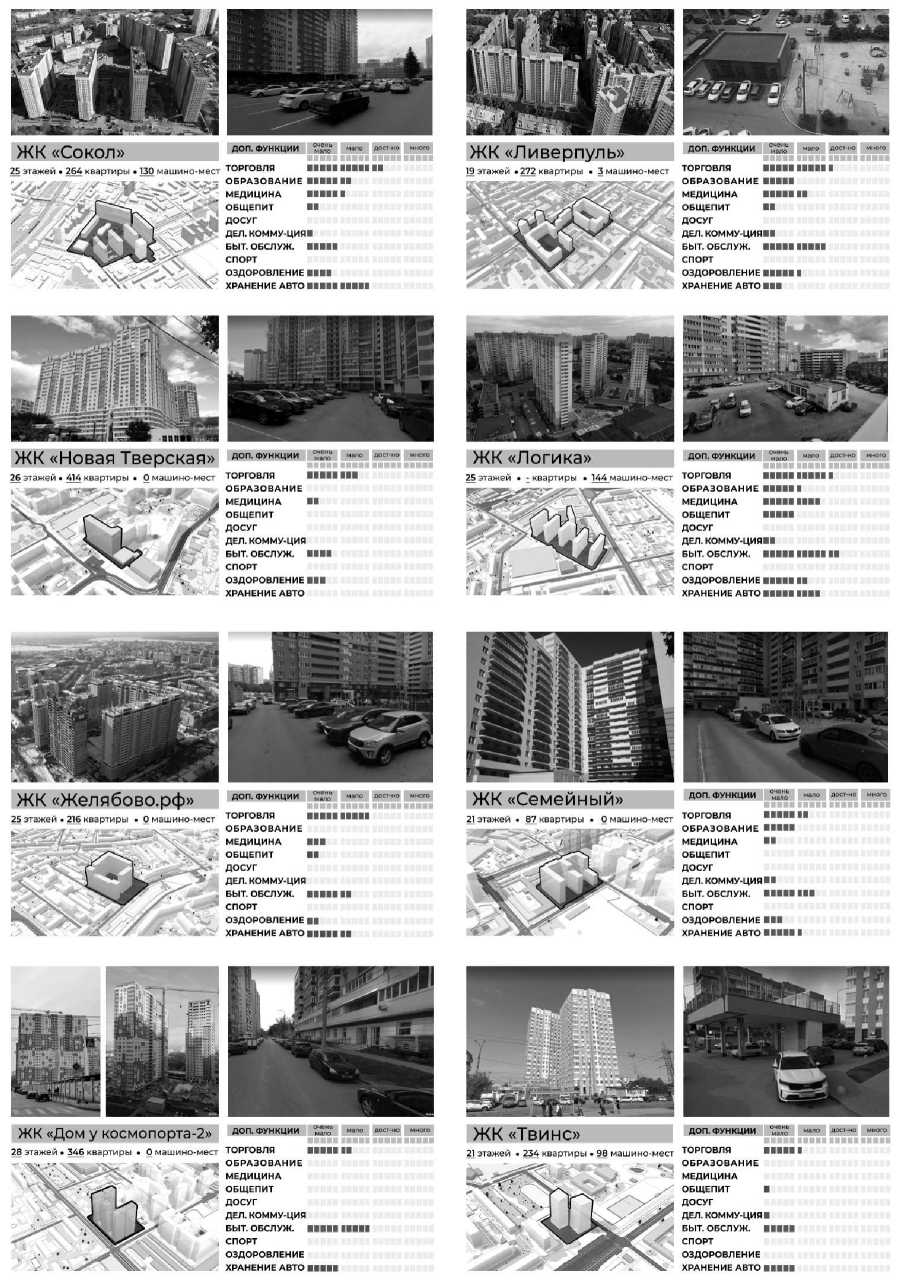 В исследовании был проведен анализ наиболее известных жилых комплексов Самары, построенных в XXI в. и иллюстрирующих описанные выше негативные тенденции. На рис. 4 рассмотрено восемь объектов, в которых проводилось выявление дополнительных и обслуживающих функций по следующим укрупненным группам: 1 – торговля; 2 – образование; 3 – медицина; 4 – общественное питание; 5 – досуг; 6 – деловая коммуникация; 7 – бытовое обслуживание; 8 – спорт; 9 – оздоровление; 10 – хранение автомобилей.