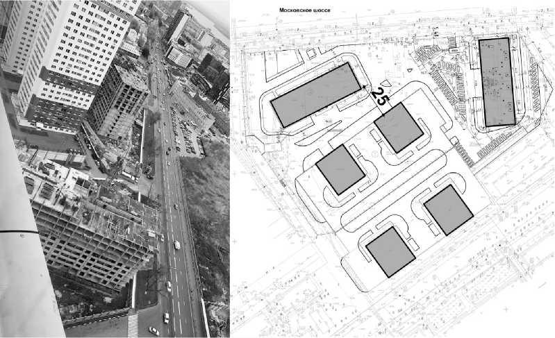 Более подробно необходимо остановиться на анализе ситуации, сложившейся на территории бывшего Хлебзавода № 9, где уже существует торгово-офисный комплекс «Вертикаль» и строится ЖК «Король Лев»/«Королев» (6 зданий, 25–26 этажей), который является ярким примером неэффективного использования городских земельных ресурсов и «образцом» негуманной сверхплотной монофункциональной жилой среды (рис. 5). Участок, выделенный под строительство, осваивается в 4 этапа. В результате реализации первой и второй очередей строительства появилось четыре 26-этажные башни с пристроенным паркингом на 712 мест. Третья и четвертая очереди – это два двухсекционных 25-этажных здания, в каждом по 384 квартиры (24 студии, 264 – однокомнатные, 72 – двухкомнатные и 24 – трехкомнатные), без паркинга, предусмотрены только парковочные места – 84 места на придомовой территории [9–11].