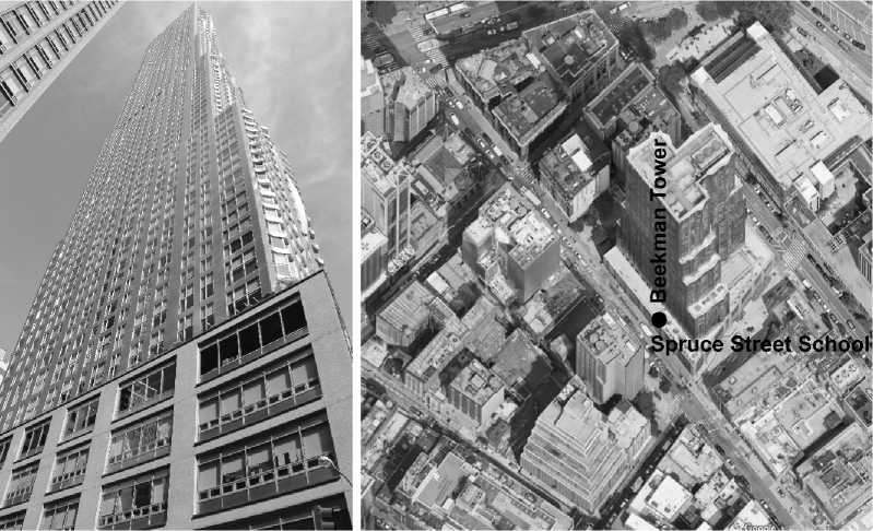 - В небоскребе Eight Spruce Street (Beekman Tower) в Нью-Йорке (265,2 м; 76 этажей) на четырех нижних этажах расположена государственная школа (Spruce Street School, PS 397), в которой обучается 440 учеников от дошкольного возраста до восьмого класса (рис. 7). Помимо школы в здании на нижних этажах расположена больница, розничные магазины и парковка. На верхних этажах разместилось 899 квартир. В дополнение к обслуживающим функциям в нижней части здания, жильцы имеют доступ к удобствам на трех клубных этажах (общая площадь – 2 050 м2). На шестом этаже находится терраса для гриля, игровая комната и гольф-симуляторы. Седьмой этаж содержит крытый бассейн, фитнес-центр, общественные зоны и спа-люкс. На восьмом этаже находятся дополнительные фитнес-залы, библиотека, кинозал и помещения для детей и подростков.