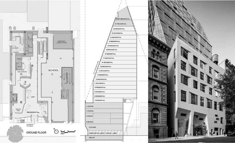 - Здание 35XV, спроектированное FXCollaborative Architects, расположено в Челси, в центре Манхэттена (рис. 8) [16]. Над существующим 6-этажным школьным зданием была надстроена 18-этажная жилая башня. Школьные этажи от жилых отделены клубным этажом с удобствами для жильцов, включая тренажерный зал, гостиную, детскую игровую комнату, винный «погреб» и общую террасу. Такой подход стал возможным благодаря уникальным техническим решениям. Была разработана гибридная структурная система со стальным каркасом в основании для размещения образовательной функции и внушительными консолями, позволяющими создать большую площадь основания башни для жилых помещений.