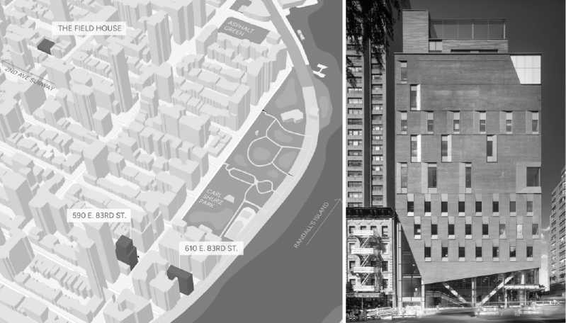 - Еще один показательный нью-йоркский пример – частная школа для девочек «Брирли» (the Brearley School) в Верхнем Ист-Сайде на Манхэттене (рис. 10). Кампус Брирли состоит из трех зданий: исторического здания школы по адресу 610 East 83rd Street, в котором обучаются ученики средней и старшей школы; нового здания школы по адресу 590 East 83rd Street, где обучаются ученики младшей школы; отдельно стоящий многофункциональный спортивный зал «Field House», расположенный в нескольких кварталах на East 87th Street, предназначенный для занятий физкультурой и спортом, включая баскетбол, теннис, бадминтон, волейбол (крыша здания представляет собой спортивное поле с травяным покрытием, предназначенное для мини-футбола и хоккея на траве с трибунами для 60 зрителей). Новое здание школы, расположенное на участке размером 30 × 23 м, было задумано как мини-вертикальный кампус. Суперсовременное 12-этажное здание, помимо классов на 700 учащихся, включает библиотеку, кафетерий, научные лаборатории, спортзал стандартного размера, просторный вестибюль и многофункциональный зал-трансформер на 600 мест. Здание спроектировано как учебное пособие LEED Gold, что позволяет ученикам активно участвовать в изучении «зеленых» технологий. В проекте реализовано много технологий по использованию возобновляемых источников энергии. На террасе на крыше школьники имеют доступ к экспериментальному саду с устройством для сбора ливневой воды.