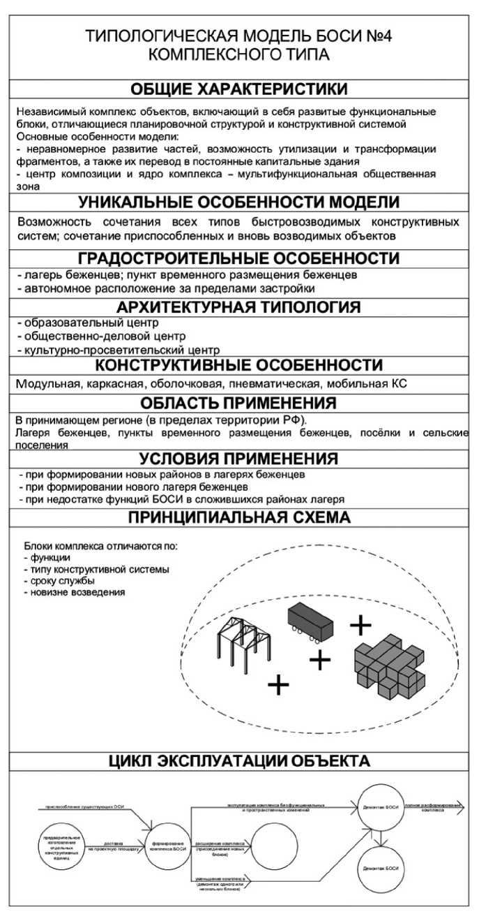 Такая модель может быть интегрирована в первую очередь застройки лагеря беженцев и пункты временного размещения, а также в сложившуюся городскую застройку. Модель БОСИ комплексного типа – масштабный комплекс объектов, требующий пространства для транспортного и пешеходного доступа к нему.