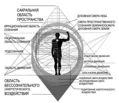 Современное представление (рис. 2) о структуре архитектурного пространства также может быть обозначено через фигуру человека, поскольку «само человеческое тело с его космическими соответствиями может стать инструментом познания действительности…» [8, с. 15]. Архитектурное пространство становится сложной искусственной системой познания человеком устройства объективного мира, а архитектурную деятельность можно рассматривать как систему совместного общения между человеком и планетой Земля. Через глобальную структуру пространства изменяется пространственное сознание человека [9].