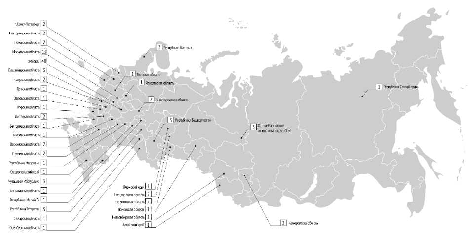 Рис. 1. Географическое распределение 110 обследованных объектов на территории России