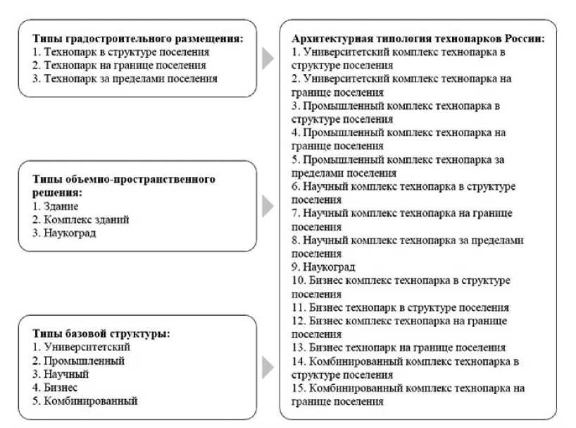 В отечественной практике проектирования зданий и комплексов технопарков по типу градостроительного размещения преобладает тип технопарка в структуре поселения: по типу объемно-пространственного решения ‒ комплексы зданий, по типу базовой структуры ‒ промышленный и научный тип.