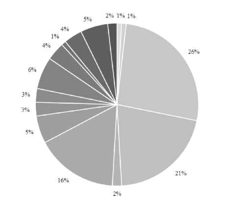 Вывод. В рамках исследования разработана исчерпывающая классификация технопарков России (см. рис. 3). Выявлено 15 сводных типов архитектурной типологии: 1. Университетский комплекс технопарка в структуре поселения – 1 %. 2. Университетский комплекс технопарка на границе поселения – 1 %. 3. Промышленный комплекс технопарка в структуре поселения – 26 %. 4. Промышленный комплекс технопарка на границе поселения – 21 %. 5. Промышленный комплекс технопарка за пределами поселения – 2 %. 6. Научный комплекс технопарка в структуре поселения – 16 %. 7. Научный комплекс технопарка на границе поселения – 5 %. 8. Научный комплекс технопарка за пределами поселения – 3 %. 9. Наукоград – 3 %. 10. Бизнес комплекс технопарка в структуре поселения – 6 %. 11. Бизнес технопарк в структуре поселения – 4 %. 12. Бизнес комплекс технопарка на границе поселения – 1 %. 13. Бизнес технопарк на границе поселения – 4 %. 14. Комбинированный комплекс технопарка в структуре поселения – 5 %. 15. Комбинированный комплекс технопарка на границе поселения – 2 %.