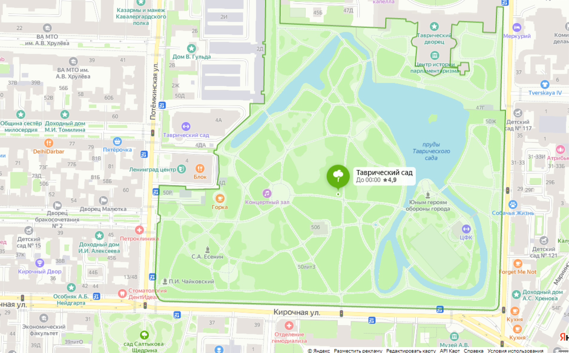 В качестве первого места отбора проб снега был выбран наиболее «чистый», по мнению автора, участок – центральная часть лесопарковой зоны (парк «Таврический сад») (рис. 2). Таврический сад относится к объектам культурного наследия и является «легкими» Центрального района города [15], однако из-за постоянного транспортного потока и расположения таких предприятий, как Завод железобетонных конструкций, Петербургский абразивный завод «Ильич» и др., загрязненность атмосферного воздуха на данной территории характеризуется как удовлетворительная только благодаря обилию зеленых насаждений. В Центральном районе располагается Летний сад, Марсово поле, Таврический, Адмиралтейский и Михайловский сады. Здесь, предположительно, благодаря обилию зеленых насаждений и их очищающей способности должно быть наименьшее воздействие на грунт со стороны основных антропогенных источников загрязнения.