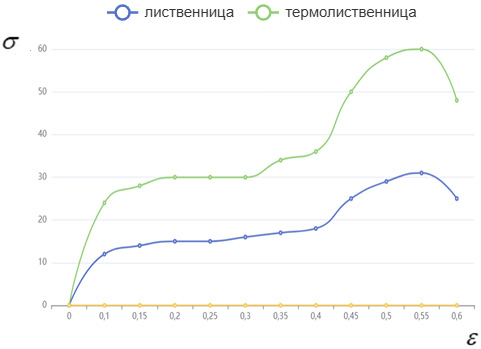 Прочность древесины на сжатие вдоль волокон и на изгиб является важным аспектом при оценке её механических свойств. Для лиственницы прочность на сжатие может достигать 50–60 МПа, что делает этот материал подходящим для конструкционных применений. В ходе экспериментов были получены данные, свидетельствующие о значительных изменениях в свойствах лиственницы после термической обработки. Основными параметрами анализа стали плотность, прочность на сжатие вдоль волокон и устойчивость к биологическим повреждениям. Результаты показали, что плотность древесины уменьшилась на 3–7 %, что связано с удалением влаги и изменением химического состава материала. При этом прочность на сжатие вдоль волокон увеличилась до 27 %, что подтверждает улучшение механических свойств древесины. По результатам испытаний была сформирована диаграмма зависимости напряжений и деформаций. Значения на графике (рис. 3) представлены по абсолютной величине (деформация ‒ сжатие).