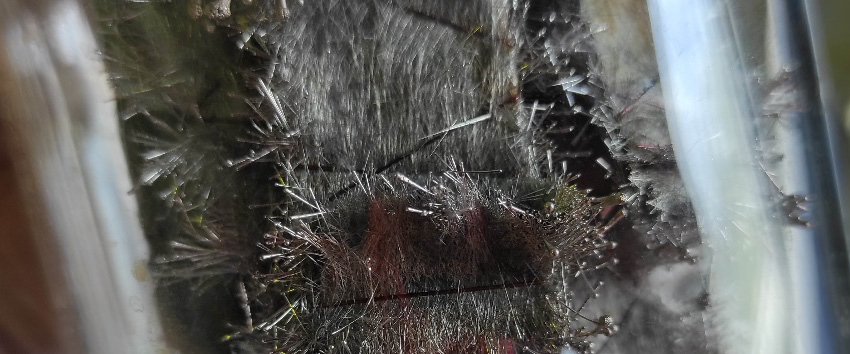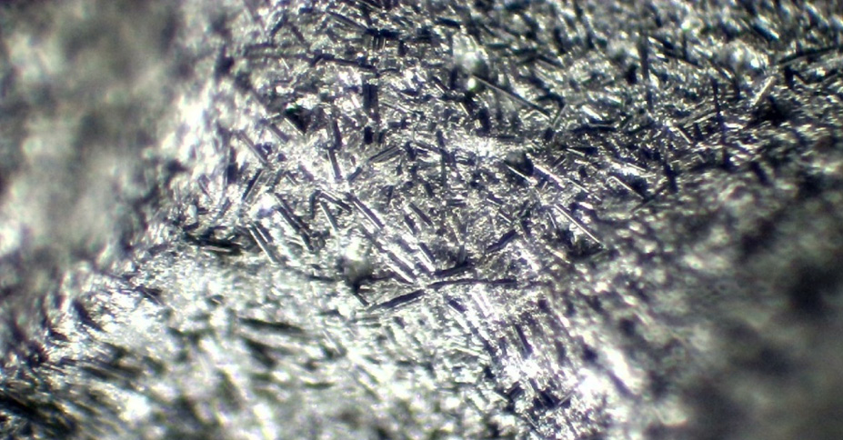 В структуре стали обнаружены включения остатков углеволокнистого катализатора в виде цилиндров углеволокна, вплавленных в металл (рис. 8). В отличие от углерода, обычно присутствующего в стали в виде аморфных бесформенных включений, в данном случае наблюдаются одинаковые по диаметру включения с примерно одним диапазоном длины.