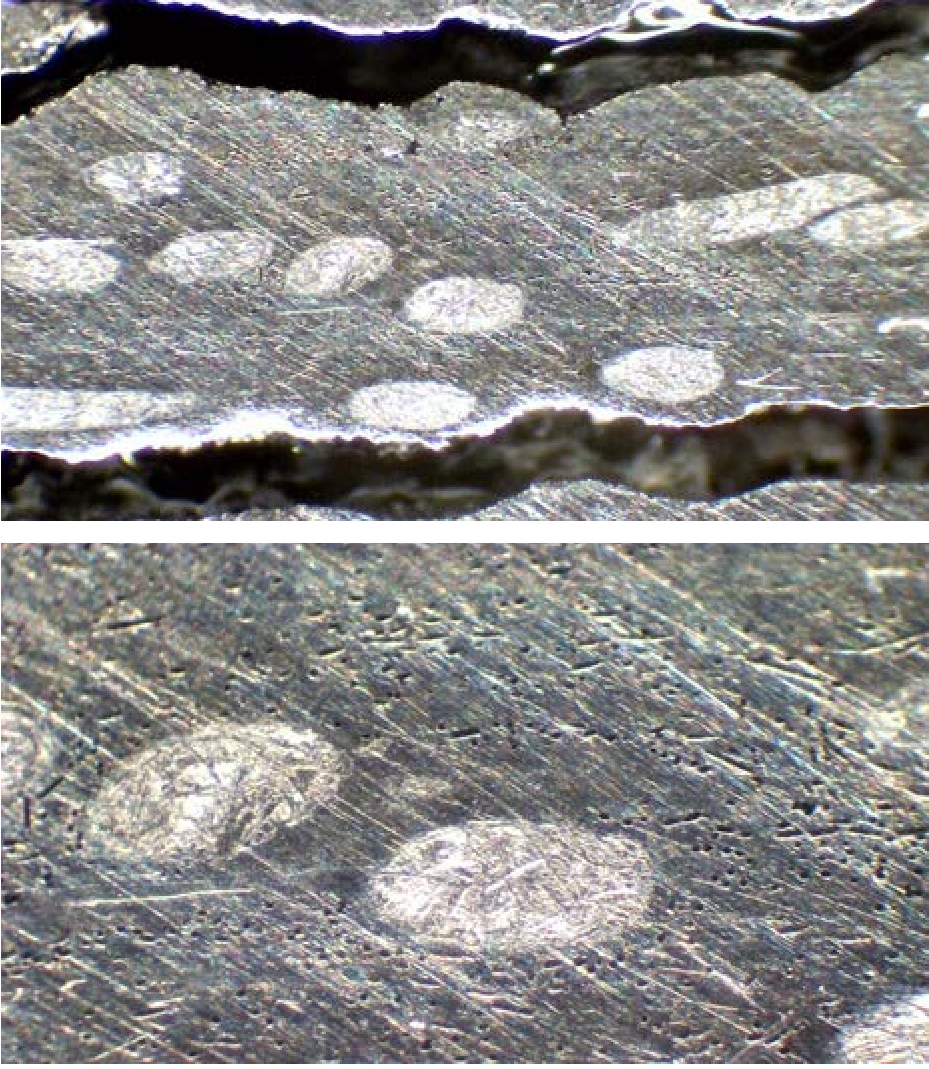 На рис. 9 представлен шлиф поперечного разреза образца стали, протравленный лимонной кислотой для повышения контрастности изображения. На микроскопическом срезе выявлены углеволокнистые включения, расположенные преимущественно параллельно относительно плоскости проката и сохранившие фрагменты волокна по всей его длине. Данная ориентация волокон может эффективно противодействовать деформациям в направлении, перпендикулярном плоскости проката, повышая сопротивление изгибу и ударным нагрузкам.