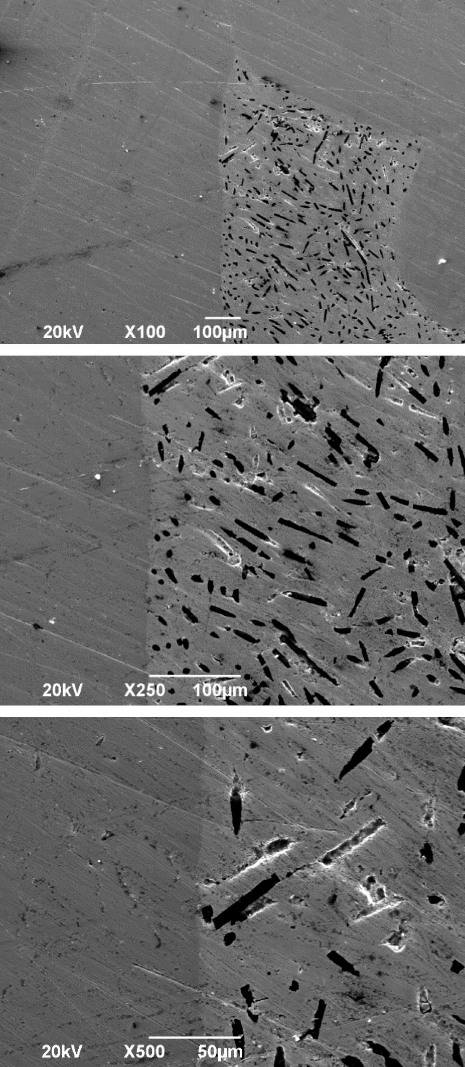 Fig. 10. Zone boundary of carbon steel and nickel alloy with carbon fiber fragments at magnifications of 100, 250 and 500×