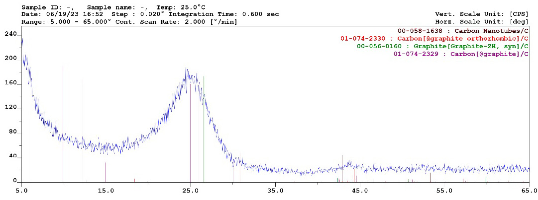 При рентгенофлуоресцентном анализе (РФА) вплавленного в металл фрагмента углеволокна на графике были обнаружены пики [6], соответствующие углеродным нанотрубкам (см. рис. 10). Таким образом, в данном образце многослойной стали углерод присутствует не только в виде графита, но и в виде углеродных нанотрубок, находящихся в составе углеволокна, из которого был изготовлен углеволокнистый катализатор.