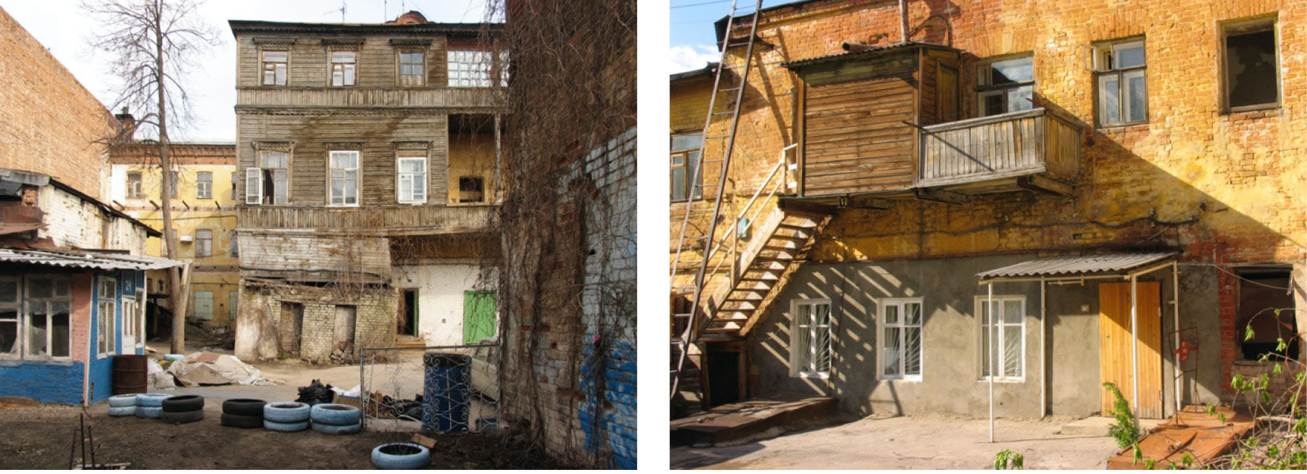 - Партисипация (соучастие жителей) – как процесс спонтанного формирования уникального архитектурного пространства и функциональных взаимосвязей.Архитектура двора эволюционировала как стихийная, анонимная трансформация жителями внутридворовых построек, включавшая: приспособление существующих зданий (бывших особняков и хозяйственных дворовых построек) к условиям коммунального проживания; самодеятельное строительство дополнительных архитектурных элементов в виде обособленных входов в квартиры на разных этажах (тамбуров, открытых и закрытых лестниц, галерей); строительство всевозможных пристроек, мансард, открытых террас, остекленных веранд и т. д. [5].