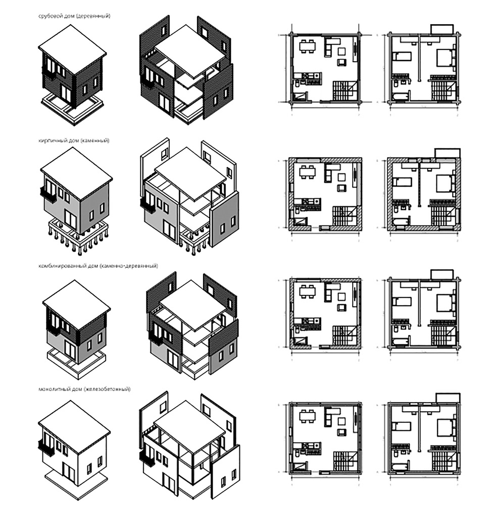 В предлагаемой концепции с применением типовых блок-модулей конструктивные решения зданий могут быть как в традиционном исполнении – кирпичные несущие конструкции (несущие стены и каркас); деревянные несущие конструкции (сруб, брус, деревянный каркас с заполнением); комбинированная конструктивная схема из кирпича и дерева, так и в современном, с использованием железобетонного или металлического каркаса, с последующим заполнением кирпичом, керамическими блоками и блоками газобетона (рис. 6). Для сокращения сроков и удешевления стоимости строительства жилые здания предлагается проектировать без подвалов. В качестве конструкции фундаментов можно применять буронабивные сваи с ростверком или монолитную железобетонную плиту.