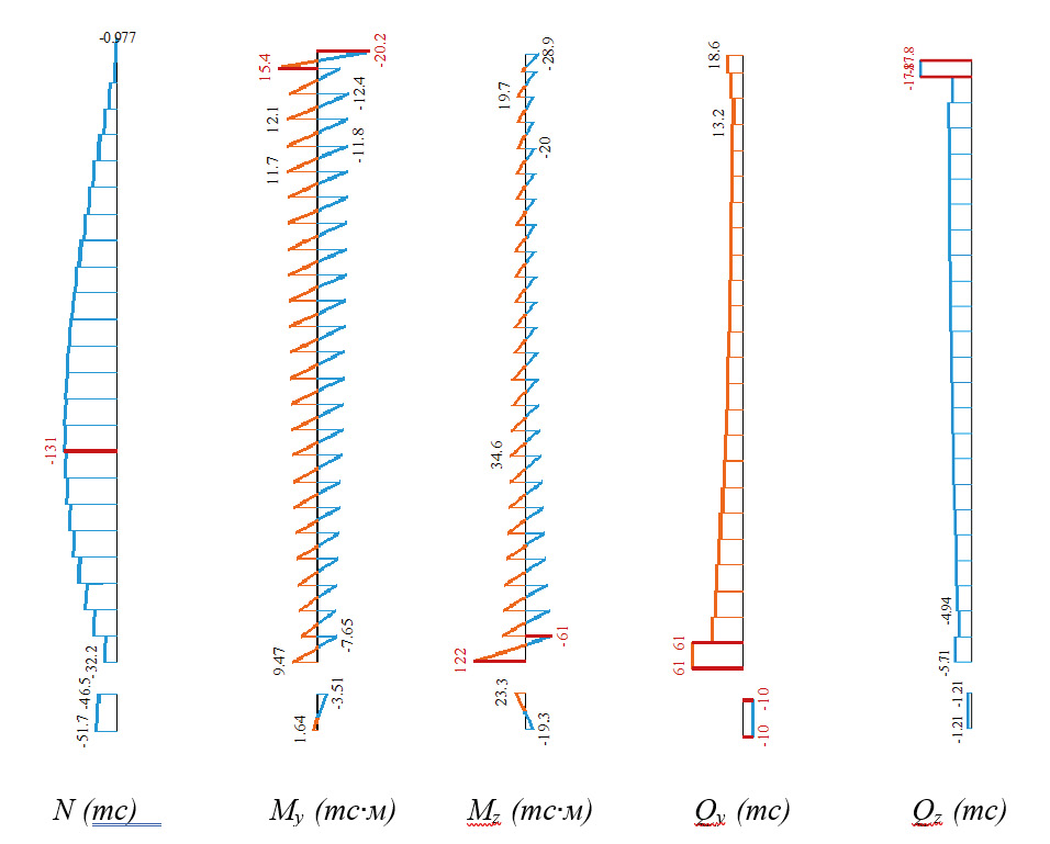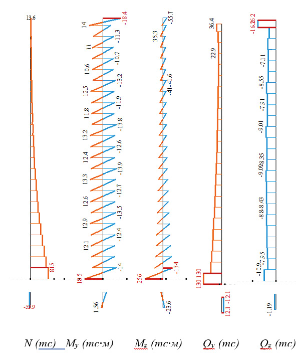 Рис. 6. Эпюры усилий в колоннах, полученные в ходе линейного статического расчета