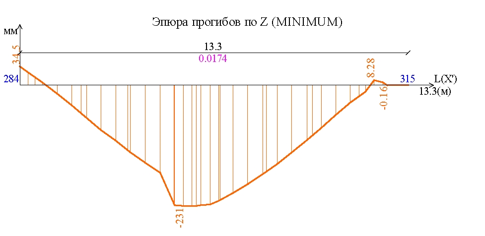 Рис. 10. Эпюра прогиба плиты перекрытия в месте над удаляемой колонной для линейного статического расчета
