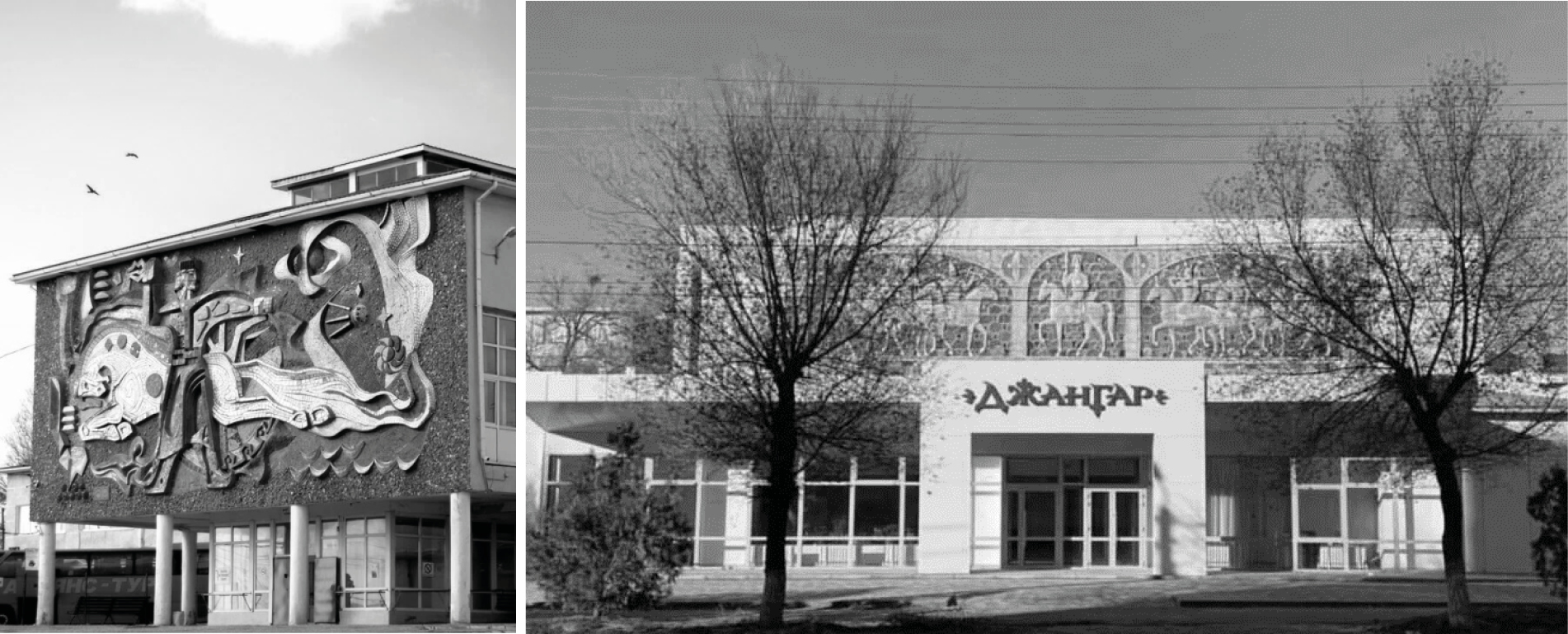 Широкое распространение как в жилых, так и в общественных сооружениях получают смежные с архитектурой направления в искусстве – монументальная живопись, художественная декоративно-прикладная деятельность, скульптура и графика стали все больше интегрироваться в новый архитектурный облик Элисты, таким образом, на фасадах зданий появляются уникальные мозаичные панно и декоративные барельефы, учитывающие национальные мотивы культуры калмыков (рис. 5). Такую ситуацию можно наблюдать на примере здания государственного театра юного зрителя, построенного в 1980-х. Фасад сооружения сочетает в себе элементы советского конструктивизма и традиционных калмыцких мотивов, демонстрируя как различные архитектурные стили могут сосуществовать в одном здании, создавая уникальное визуальное восприятие. В традиционной народной архитектуре, особенно в культовых сооружениях, значительное место занимают смежные виды искусства, которые, взаимодействуя с архитектурой, придают зданиям уникальную художественную притягательность – все это делает, казалось бы, ординарные типовые проекты, неповторимыми и интересными объектами в контексте городской среды [8].