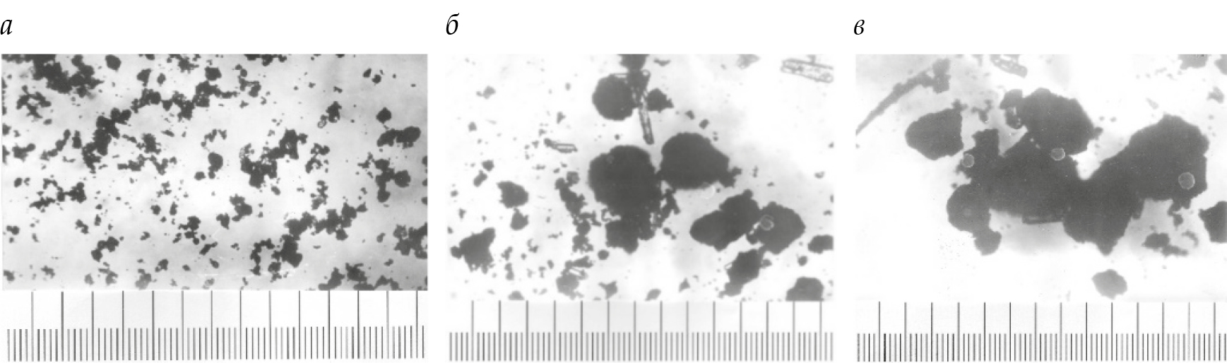 Рис. 1. Металлографический анализ сырьевых компонентов: а ‒ бентонитовая глины; б – фосфорный шлак; в ‒ золошлаковая смесь