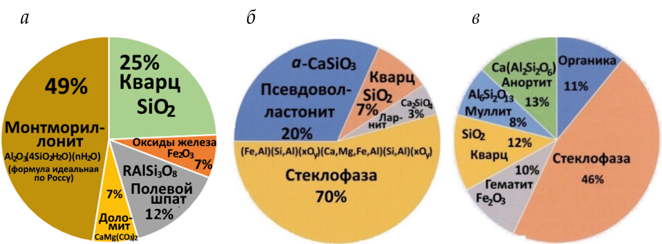 Рис. 2. Минералогический состав сырьевых компонентов: а – бентонитовая глина; б ‒ фосфорный шлак; в ‒ золошлаковая смесь