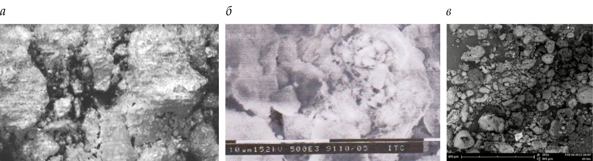 Рис. 3. Микроструктура сырьевых компонентов: а – бентонитовая глина; б – фосфорный шлак; в ‒ золошлаковая смесь