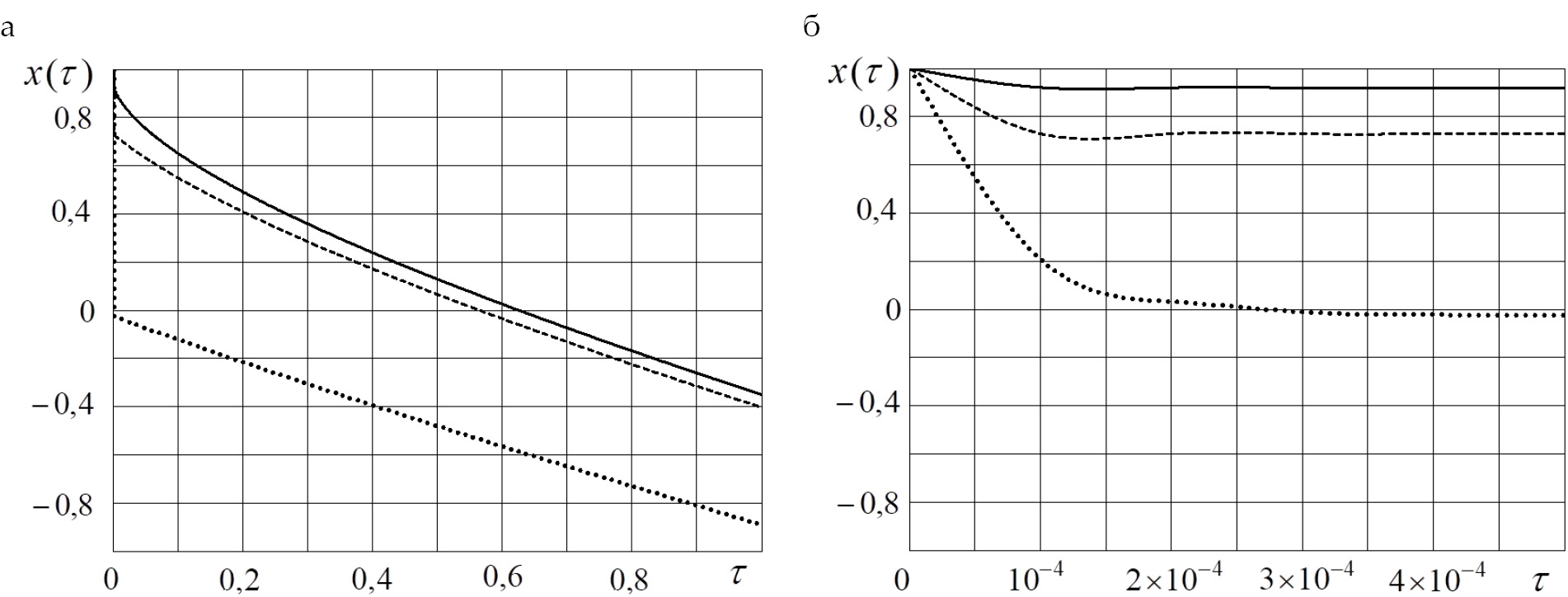 Dependence of the dimensionless thickness x(τ) = h(τ) / h0в of the liquid layer on the ground (granite crushed stone 5×20 mm) on the dimensionless time τ = t / t0
