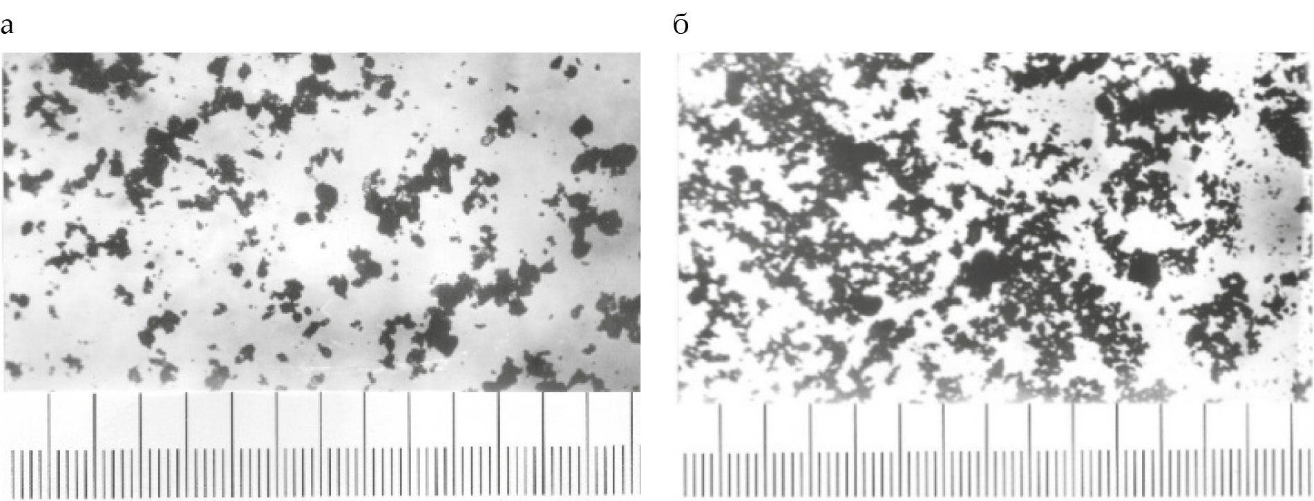 Минеральный состав отходов флотации углеобогащения показал, что основным минералом является гидрослюдисто-каолинитовый аргиллит с небольшой примесью гидрослюды ‒ 5–10 %, а суммарное содержание ‒ 66 % (см. рис. 2, б). Согласно металлографическому анализу, в образцах исследуемых отходов флотации образуется повышенное количество мелких и средних включений как неорганического, так и органического происхождения (средний размер отходов флотации углеобогащения частиц от 1–3 до 3–5 мкм, черного цвета, см. рис. 1, б).