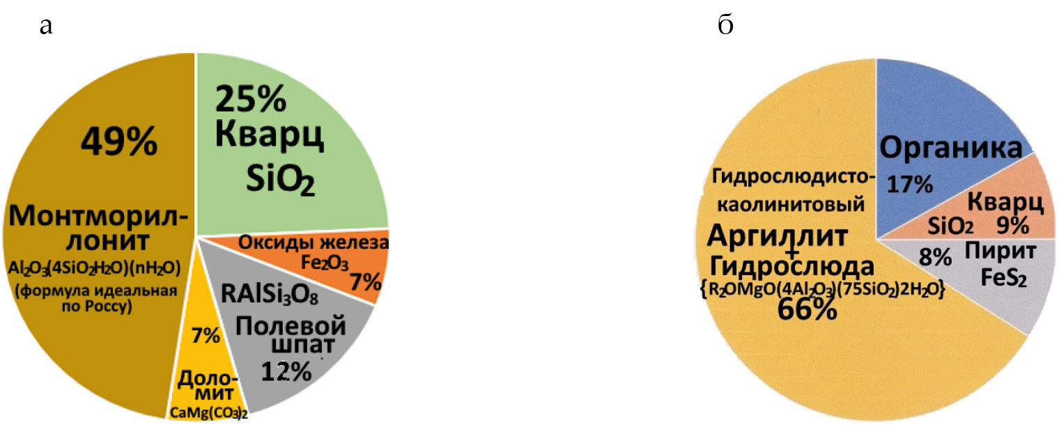 В основу алевролита могут входить частицы полевых шпатов, глинистые минералы, карбонаты и гидроксиды железа, кварц, а базисными накапливаемыми минералами аргиллитов, как правило, являются в первую очередь гидрослюды, затем смешаннослойные минералы, каолинит и в последнюю очередь монтмориллонит, а от сланцев аргиллит отличается отсутствием трещиноватости и параллельного наслоения [19, 20].