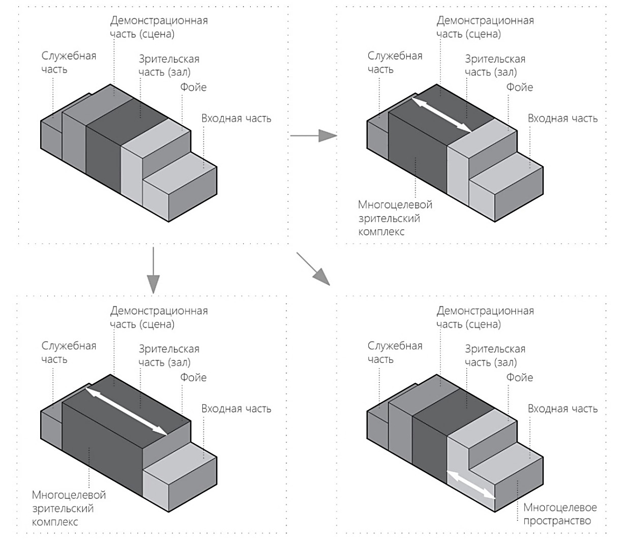 Рис. 3. Концептуальные схемы формирования многоцелевых пространств зрелищного объекта